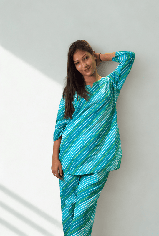 Bring effortless charm and comfort to your wardrobe with this striped pure cotton co-ord set, available in three versatile colors — red, green, and blue. Designed with diagonal stripes that flatter the silhouette, this outfit is the perfect blend of elegance and everyday ease.